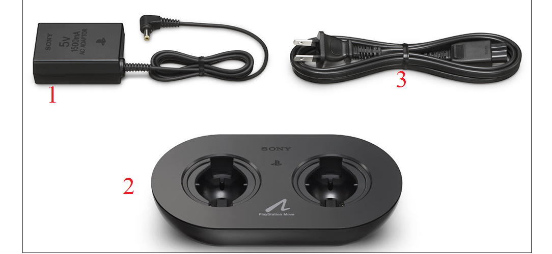 1Возьмите станцию и подключите ее к розетке с помощью соответствующего кабеля. На рисунке 5 можно видеть фирменное устройство от Sony. Запчасть, обозначенная цифрой 1, подключается к запчасти 2. Кабель под номером 3 подключается к запчасти 1 и включается в розетку. Все предельно просто!