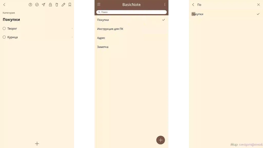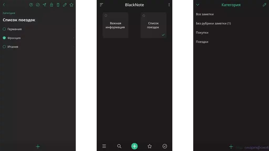 - Типы заметок: текстовые записи и чек-листы.