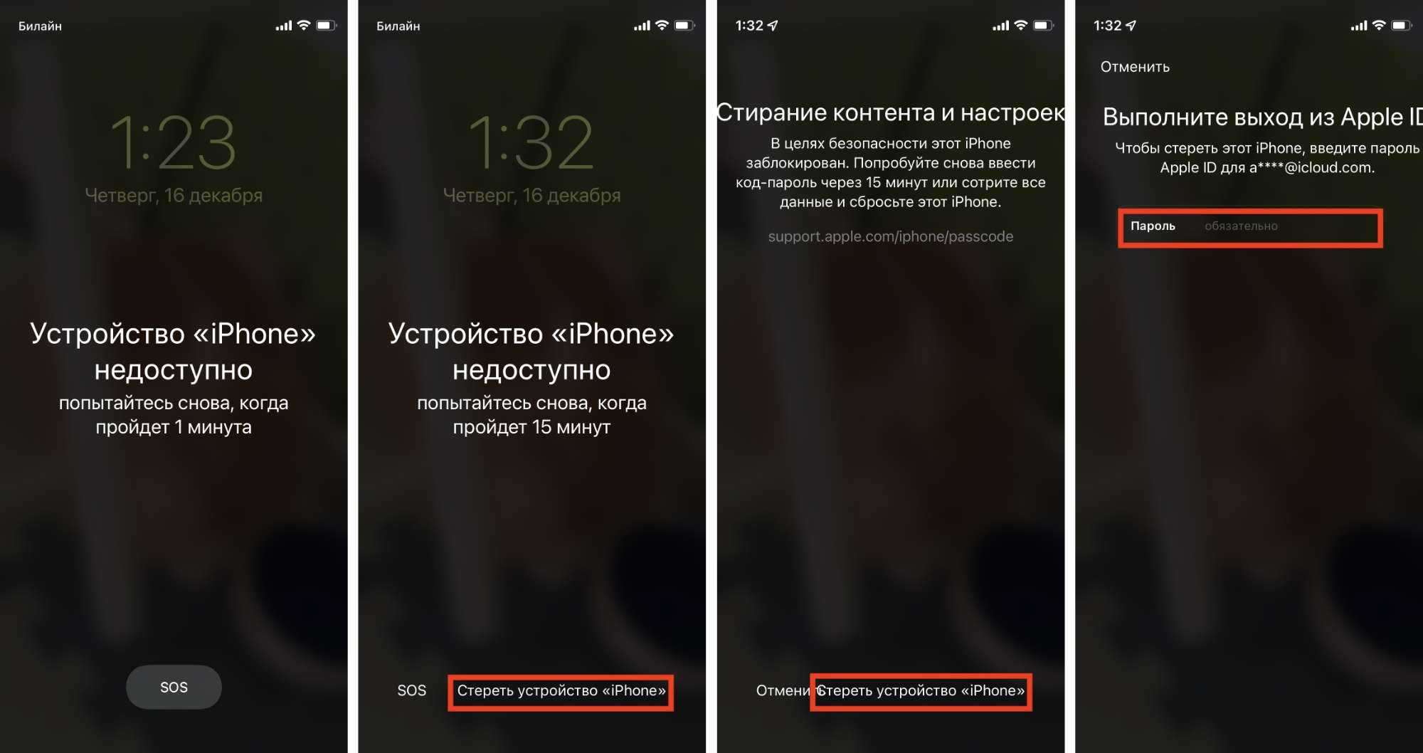 Шаг 1. Вам нужно несколько раз подряд ввести неправильный пароль. Можете использовать эти попытки, чтобы попытаться вспомнить код — возможно, дальнейшие действия вас и не понадобятся. Если на устройстве активирован Face ID, закройте пальцем фронтальную камеру, чтобы экран не разблокировался, отсканировав ваше лицо. Это займёт некоторое время: после неудачных попыток ввести пароль следующая попытка будет разрешена только через несколько минут.