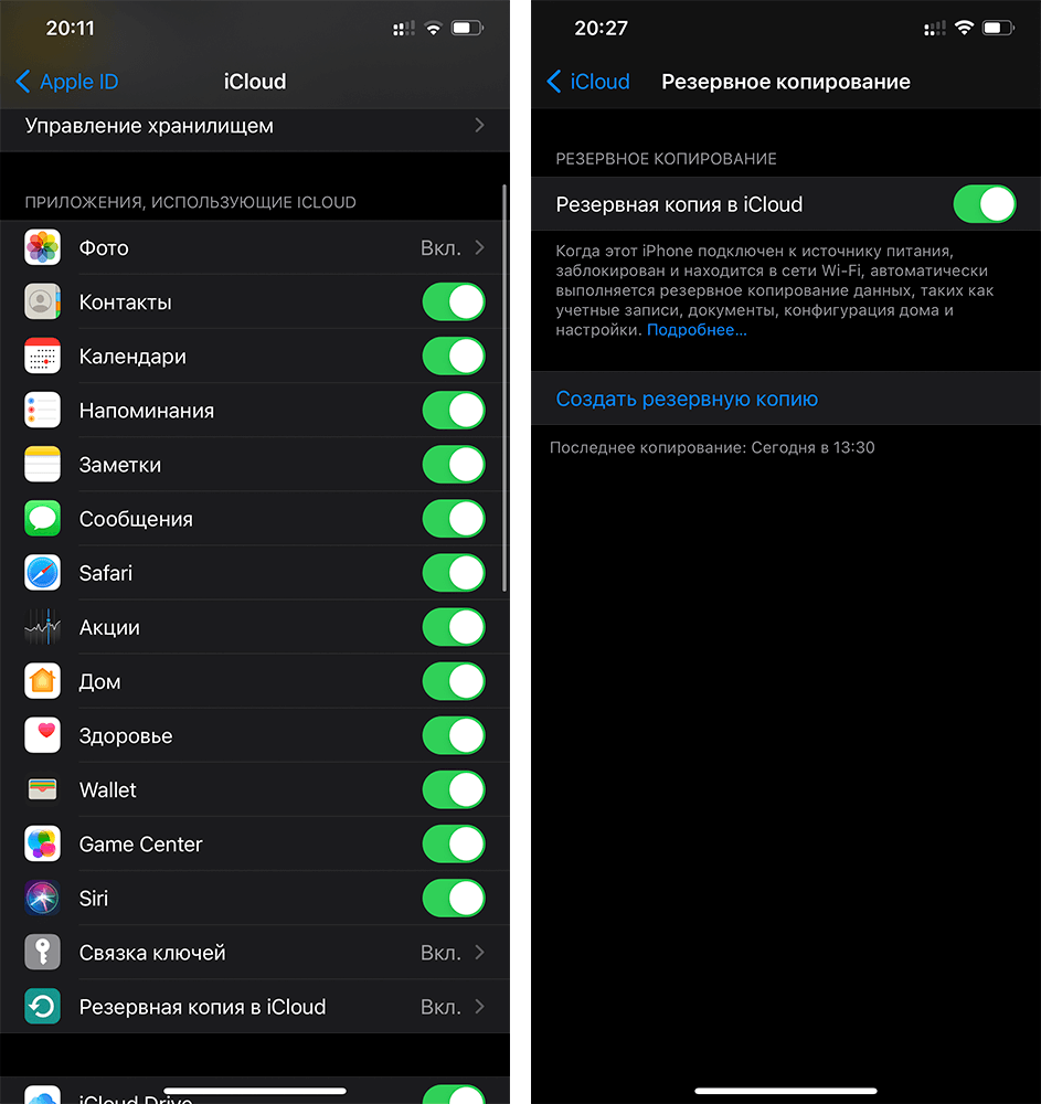 Затем необходимо зайти в настройки iCloud на iPhone и сделать резервную копию.