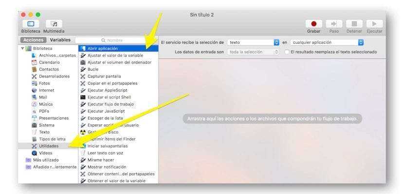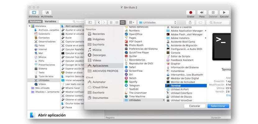 Теперь тащим Открыть приложение в рабочую область потока и в раскрывающемся меню выбираем приложение терминала, которое, поскольку оно не отображается в списке, мы должны нажать на Прочее> Приложения> Папка Утилиты> Терминал.