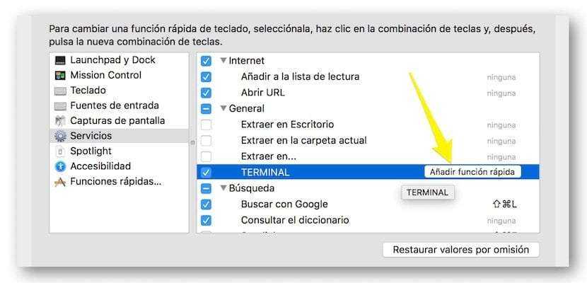 Чтобы создать терминал рабочего процесса, теперь вам нужно назначить сочетание клавиш для потока ТЕРМИНАЛ. Для этого мы открываем Системные настройки> Клавиатура> Ярлыки> Службы и мы добавляем комбинацию ключей, которую хотим в TERMINAL.