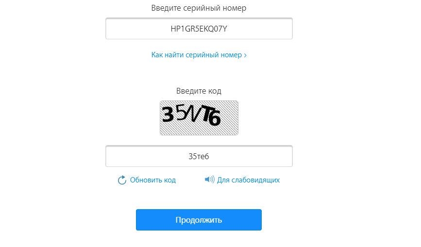 Шаг 2. В строке «Введите серийный номер аппаратного оборудования» укажите серийный номер проверяемого устройства и нажмите «Продолжить