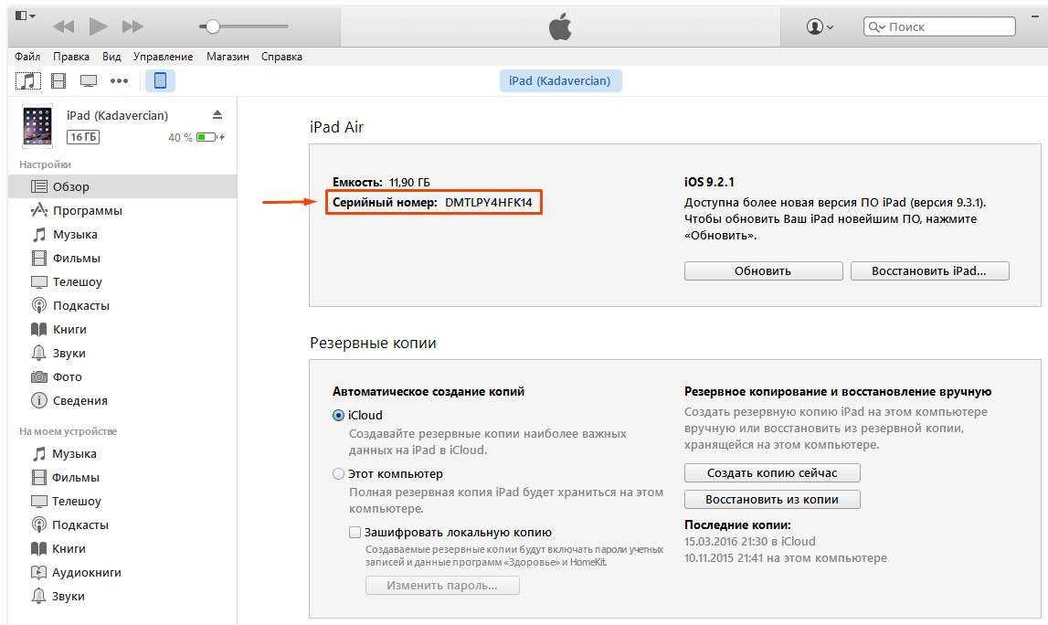 Еще один способ – программа iTunes. Запустите ее и подключите устройство к компьютеру при помощи кабеля. Нажмите на название своего гаджета, и на вкладке «Обзор», отобразится его серийный номер: