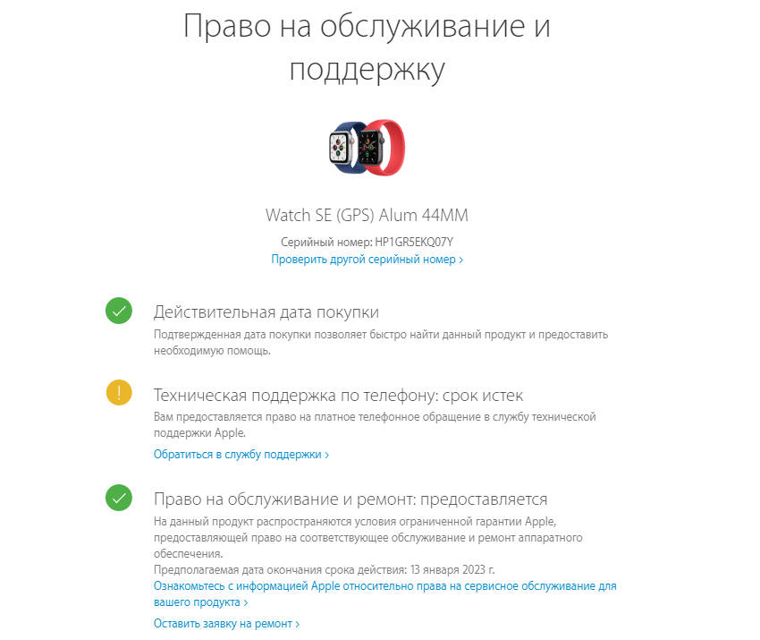 Как видно на скриншоте выше, таким образом, можно быстро проверить гарантию Apple, что важно, в случае если продавец заверяет вас, что она еще действует. Таким образом, вы сможете убедиться в этом самостоятельно
