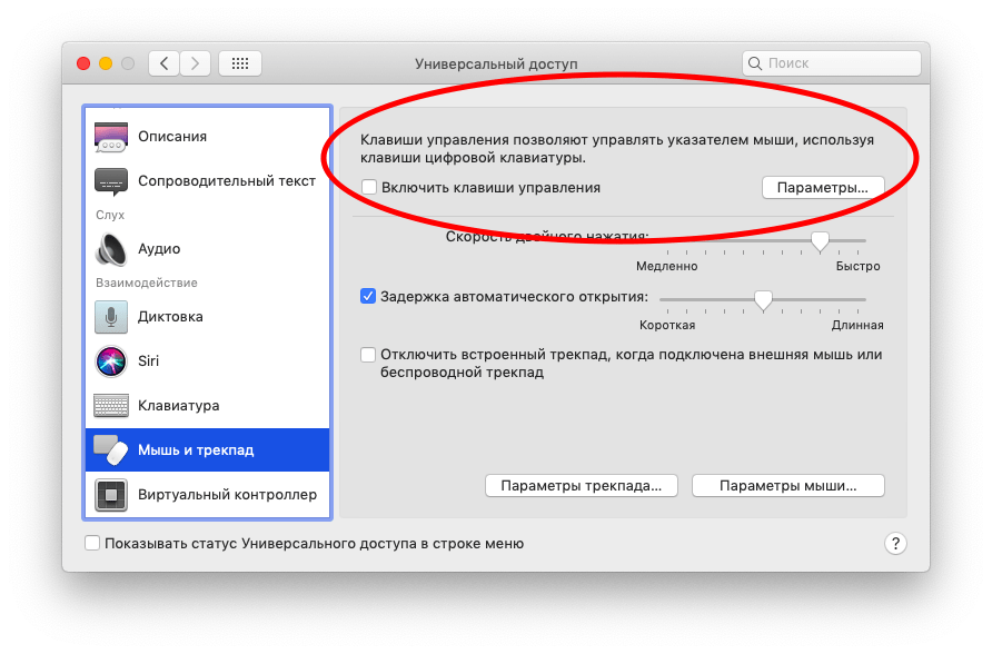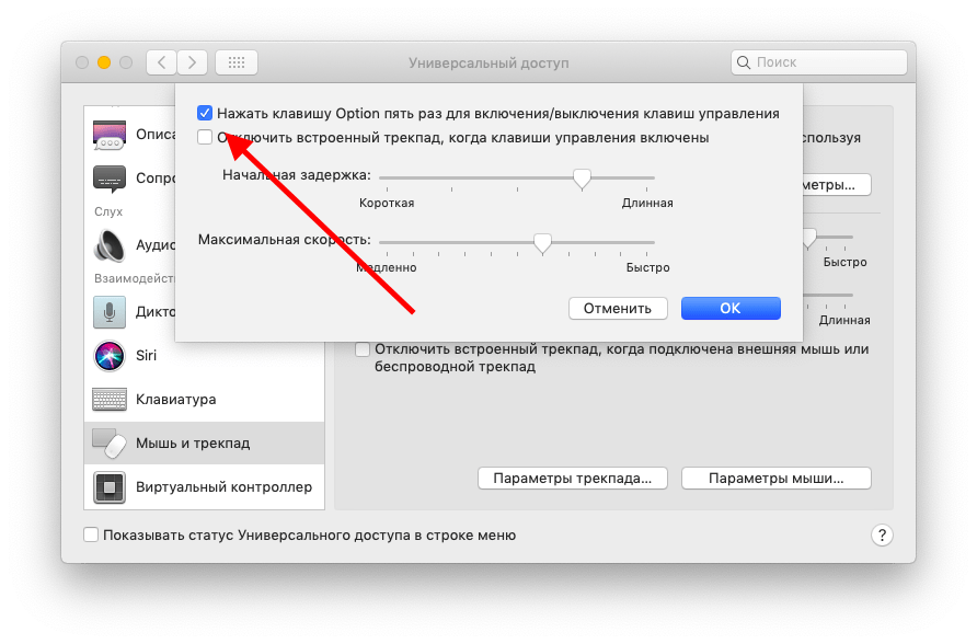 Кто-то назовет эту «неработающую» клавиатурой багой, но в Apple считают, что это «фича». Дело в том, что виной всему… функция Клавиши управления. Активировать ее можно в настройках в разделе Универсальный доступ и далее в подразделе Мышь и трекпад.