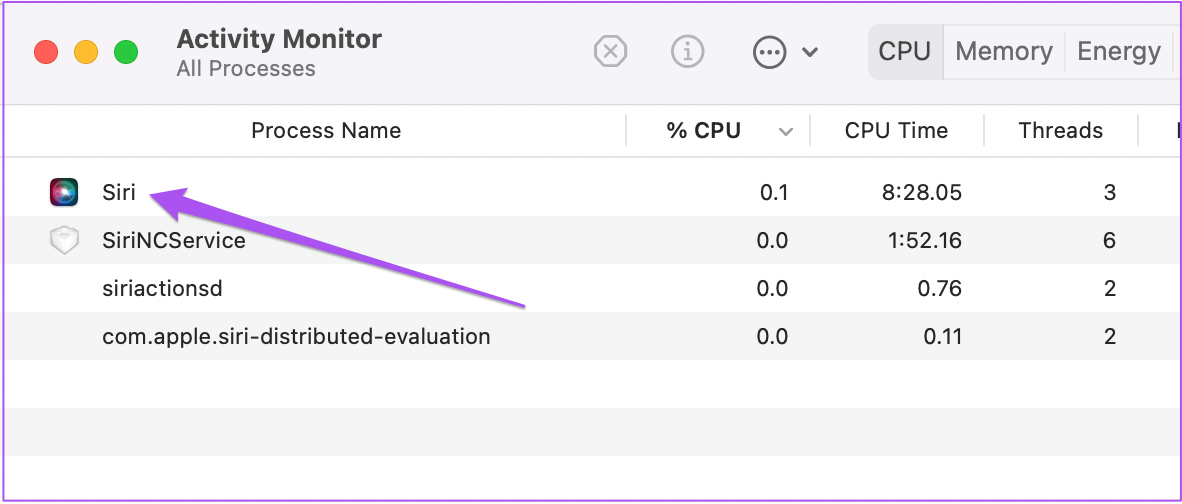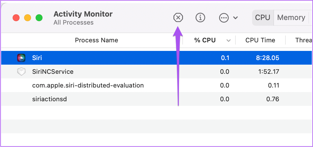 Шаг 4: Выберите Siri из списка и щелкните значок «Стоп» вверху.