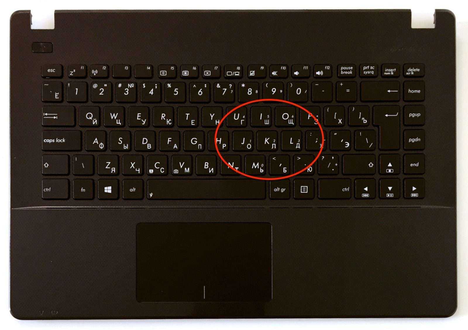 Если вы ее включите, то сможете управлять курсором мыши с помощью клавиш цифровой клавиатуры. Вот она выделена на фотографии…