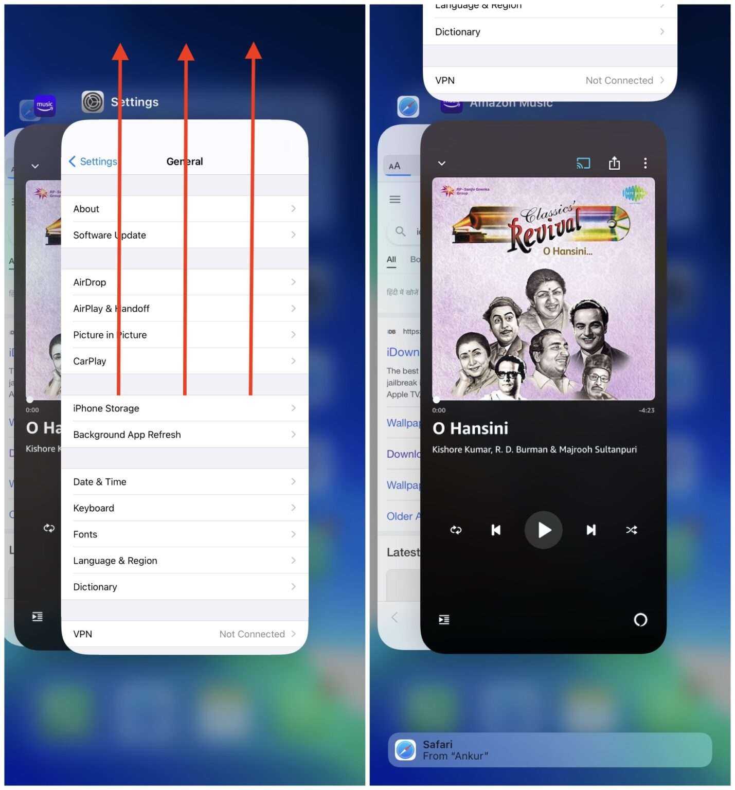 Откройте переключатель приложение и смахните вверх карточку приложений Настройки.