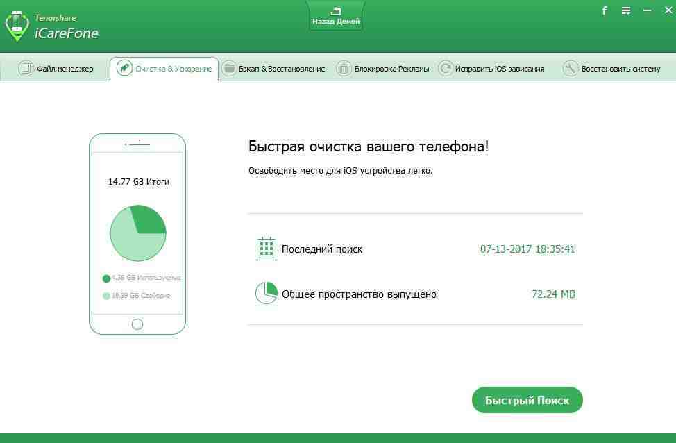 Tenorshare iCareFone это инструмент , чтобы исправить все вопросы для iPhone, iPad и iPod. С этим инструментом, вы можете легко очистить от ненужных файлов и ускорить ваши устройства. Это самый верный способ ускорения работы айфона.