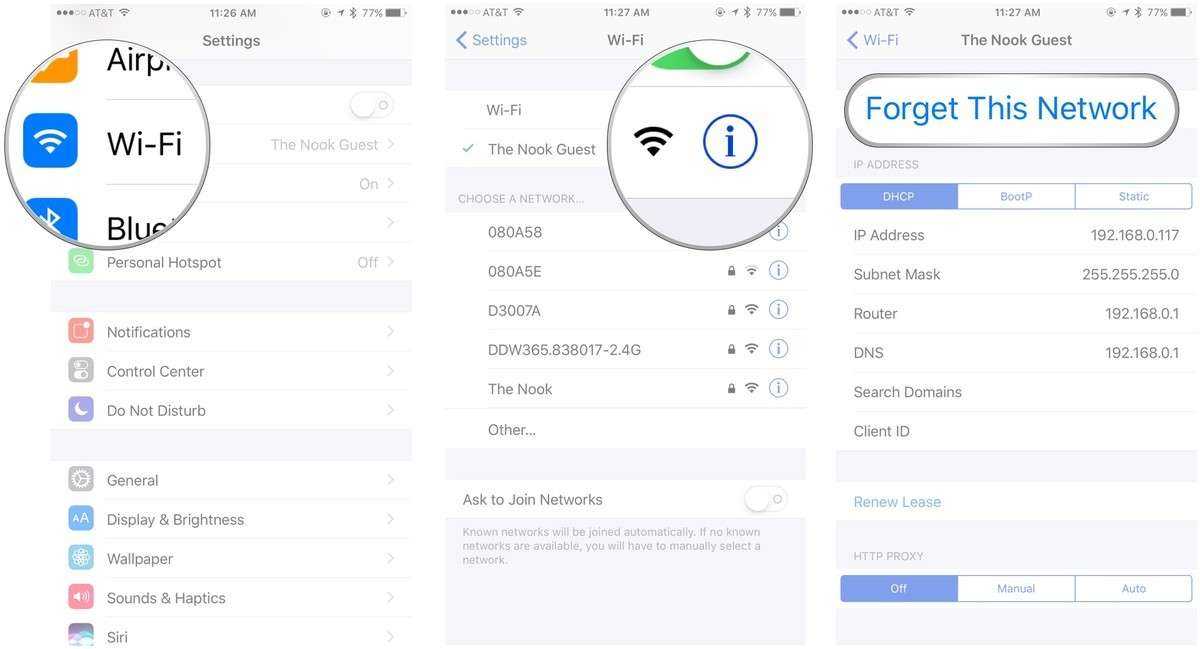 Если Айфон не подключается к Wi-Fi, можно попробовать подключить мобильник к сети заново. Однако перед этим необходимо выполнить ряд действий, перечисленных ниже.