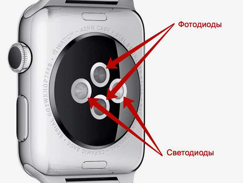 Кровь поглощает зеленый свет и отражает красный. Пара светодиодов Apple Watch моргает со скоростью несколько сотен раз в минуту, а два фотодиода фиксируют количество отраженного света.