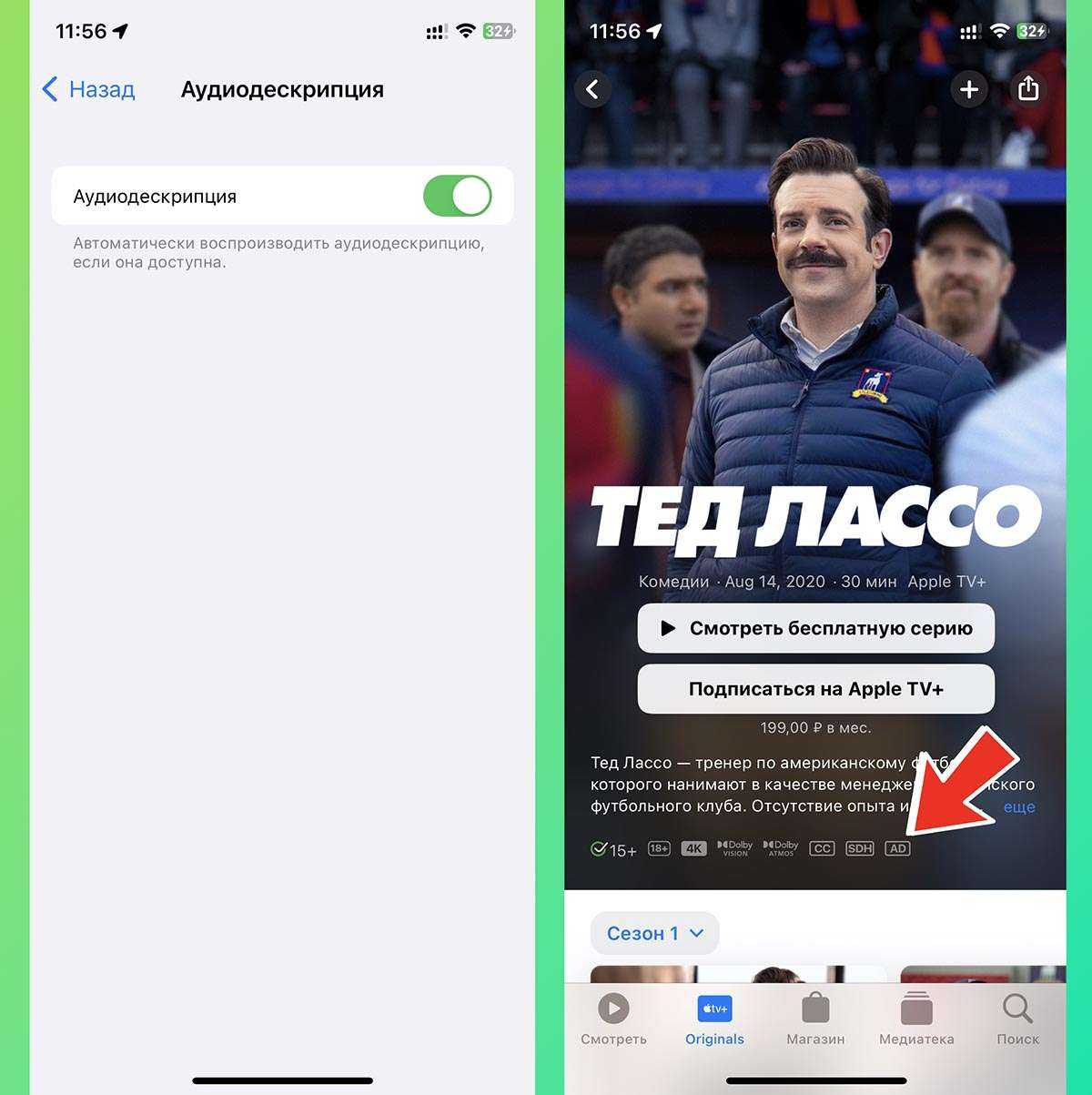 На данный момент такая озвучка есть, например, в приложениях iTunes и Apple TV. Опция обозначается символом »AD» на карточке фильма.