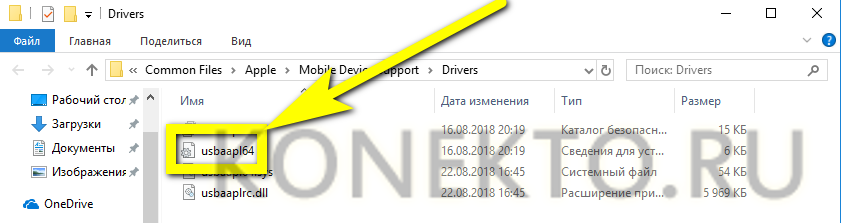 В открывшемся системном каталоге найти файл usbaapl64.inf. Если расширения скрыты, проще всего ориентироваться на значок: в левом нижнем его углу будет изображена шестерёнка.