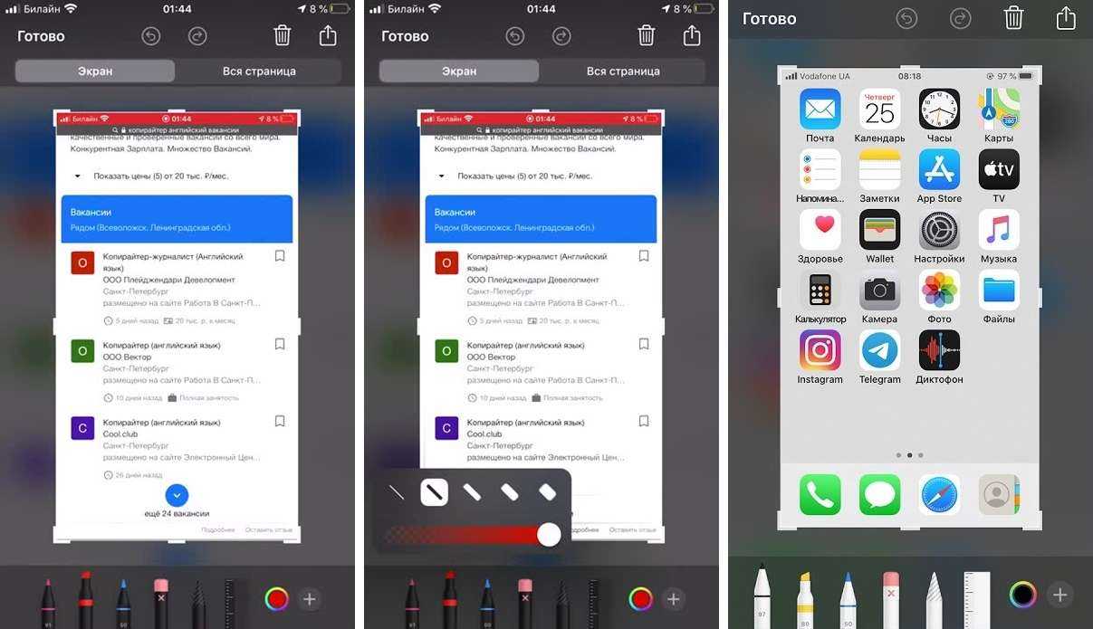 Еще одна распространенный вопрос, который возникает у пользователей-новичков: как редактировать скриншот и можно ли это вообще сделать. Особенно часто нужда в этом возникает, если нужно сделать скрин видео на айфоне, так как в этом случае картинку придется обрезать. Чтобы открыть медиафайл для редактирования, нужно нажать по миниатюре, которая выплывает сразу после создания скрина.