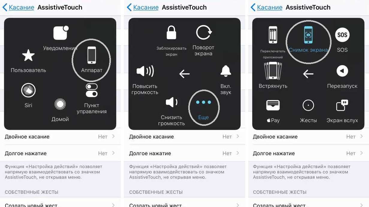 В результате на экране появится небольшая круглая кнопка, которую можно передвигать по экрану куда угодно. Для того чтобы сделать скриншот без использования аппаратных кнопок, нужно нажать на эту круглую кнопку и выбрать «Аппарат – Еще – Снимок экрана». Нужно отметить, что при создании скриншота таким способом меню AssistiveTouch не попадет в кадр.