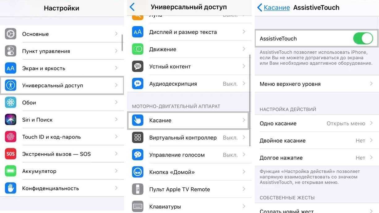 На новых версиях iPhone встроено приложение-скриншотер под названием AssistiveTouch. Этот инструмент позволяет делать снимки экрана при помощи специальной кнопки, но по умолчанию он находится в спящем состоянии. Чтобы сделать с помощью этой опции скрин, предварительно потребуется ее включить.