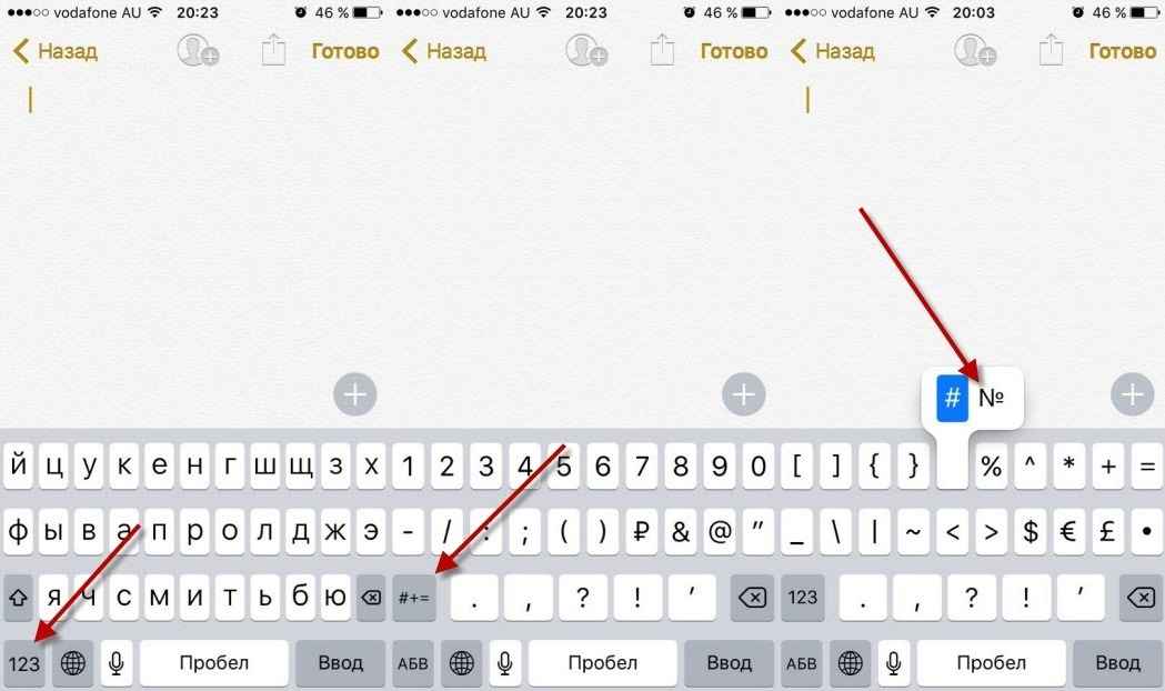 Обычно клавиатура iOS по умолчанию представляет только алфавит. Чтобы узнать, где «номер» на клавиатуре айфон, надо нажать кнопку «123» и тогда появятся цифры и значки. Символ «номер» в iPhone спрятан в этом меню. Чтобы вернуться к буквам, нужно нажать клавишу «ABC». Любой, кто знаком с устройствами Android, знает, что можно нажимать и удерживать кнопки с буквами для доступа к цифрам и значкам. Пользователи iPhone не имеют такого удобства, но этот маленький трюк почти так же удобен. Если нажать и удерживать кнопку цифры, то можно провести пальцем вверх по нужному символу.