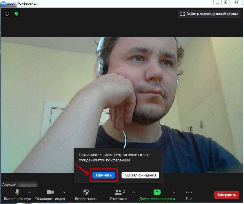 При подключении пользователя к собранию потенциальный участник сначала попадает в зал ожидания. Удостоверьтесь, приглашали ли вы человека на встречу, и нажмите на голубую кнопку «Принять», если лицо допущено к мероприятию.