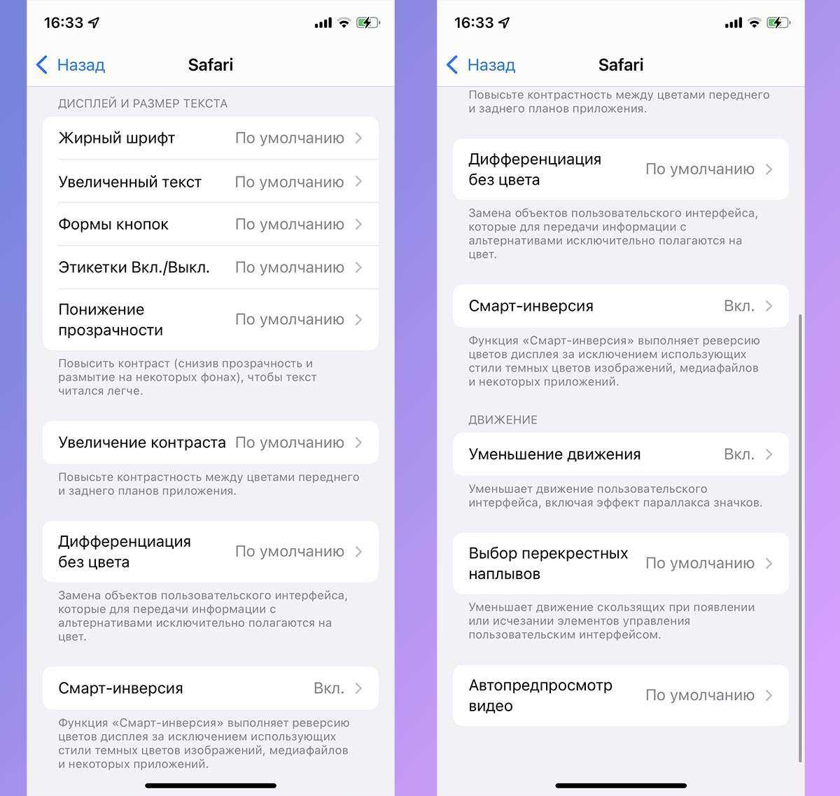 Особого внимания заслуживает опция Смарт-инверсия. Продвинутые пользователи iOS вспомнят данную фишку, которую ранее можно было применять только для всех приложений одновременно (Настройки – Универсальный доступ – Дисплей и размер текста – Смарт-инверсия), включая своеобразную темную тему интерфейса iOS до ее официального появления.