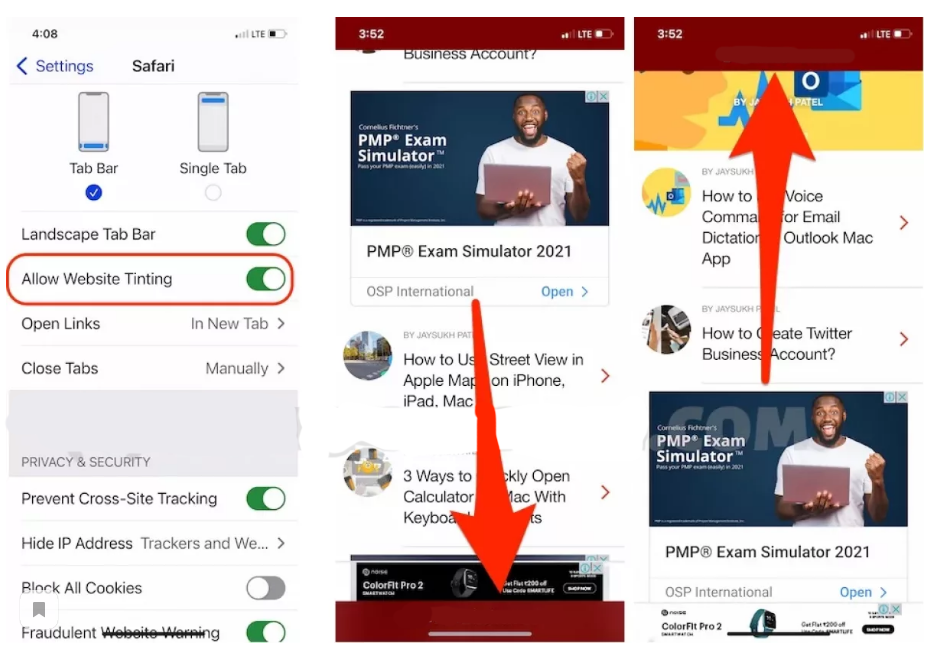 Изменение цвета фона вкладки Safari на iPhone в iOS 15: тонирование веб-сайта