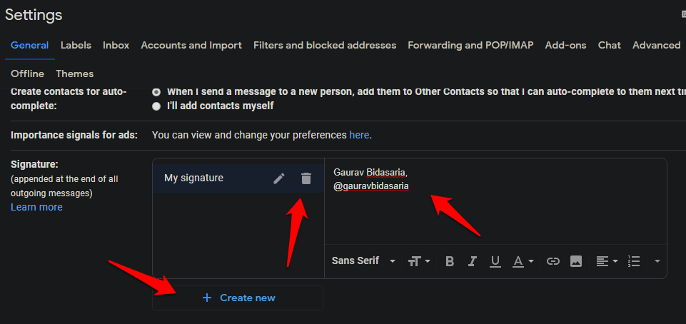 Вы найдете возможность создавать и управлять несколькими подписями на вкладке «Общие». Просто прокрутите немного, чтобы найти. По умолчанию должно быть одно поле для подписи, но вы создаете больше, нажимая кнопки «Создать».