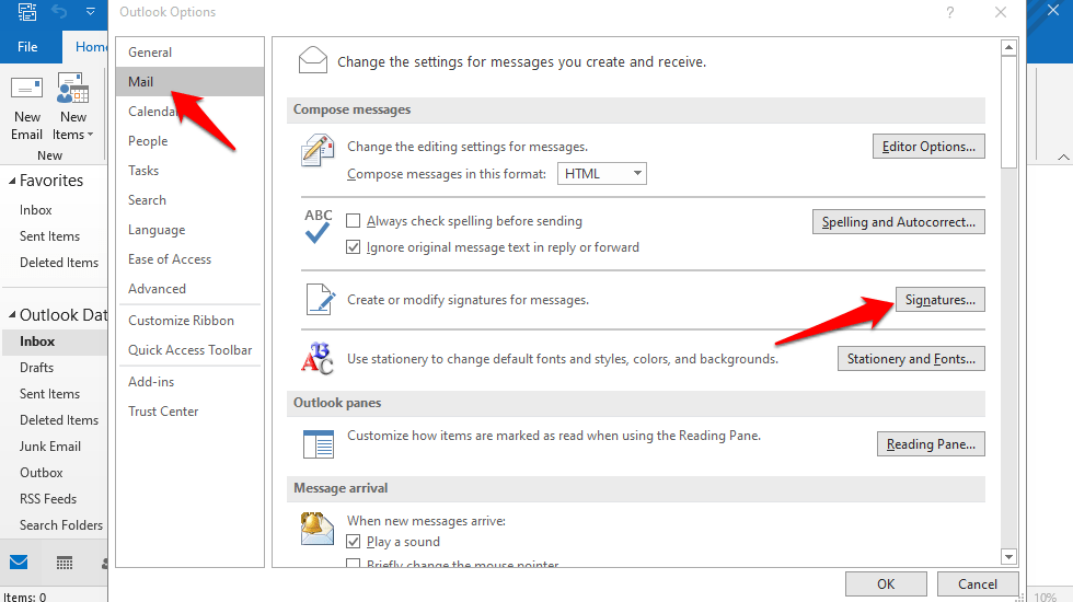 В окне «Настройки почты» щелкните значок «Подписи».