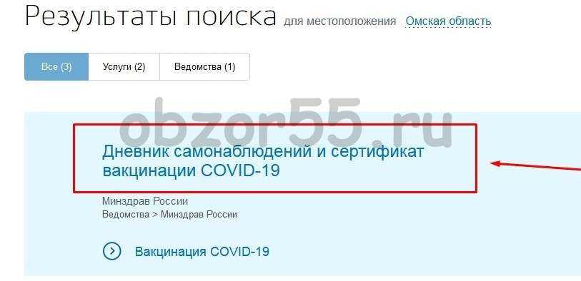 На странице результата поиска выбираем услугу «Дневник самонаблюдений и сертификат вакцинации COVID-19».