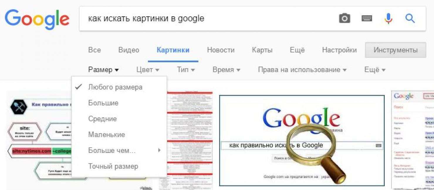 Указание размера. В этом пункте можно выбрать картинки любого размера, большие, средние, маленькие, точный размер и размер больше чем определенный шаблоном.