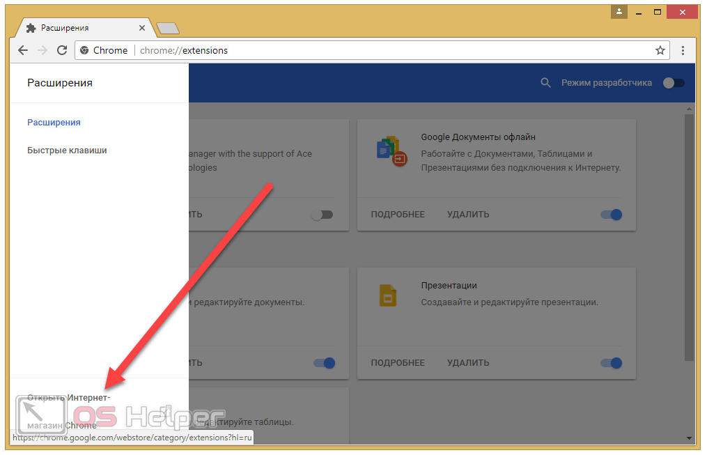 - Открыть меню настроек Google Chrome, развернуть пункт «Дополнительные инструменты» и выбрать из предложенного списка раздел «Расширения».