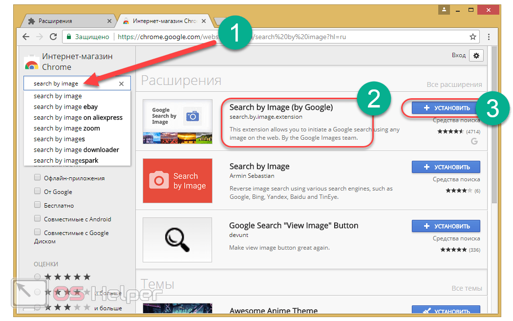 - В поисковую строку, расположенную в левой части страницы, вписать запрос «Search by image», после чего в списке результатов найти «Search by Image (by Google)» и кликнуть по кнопке «Установить».