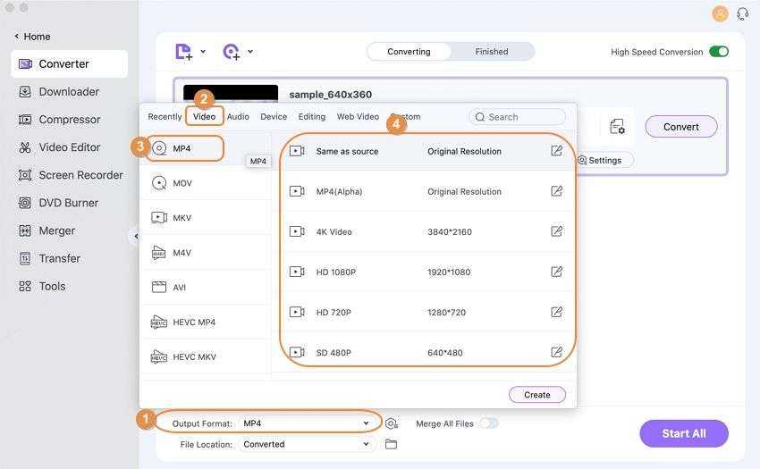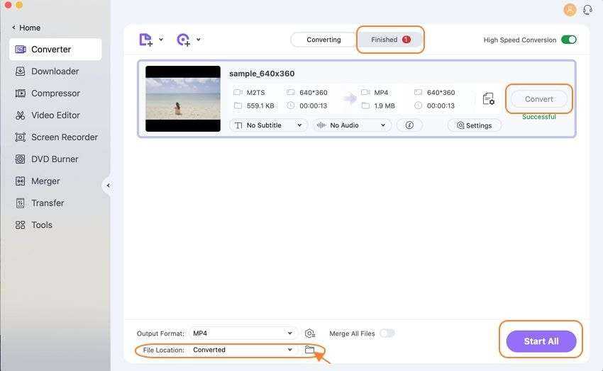 Нажмите кнопку Начать все тобы начать преобразование файлов по своему усмотрению, если все настройки выполнены. Вы можете выбрать папку «Местоположение файла» для сохранения файлов на Mac. Ваши файлы будут преобразованы в течение нескольких минут с помощью лучшего конвертера файлов Wondershare для Mac.