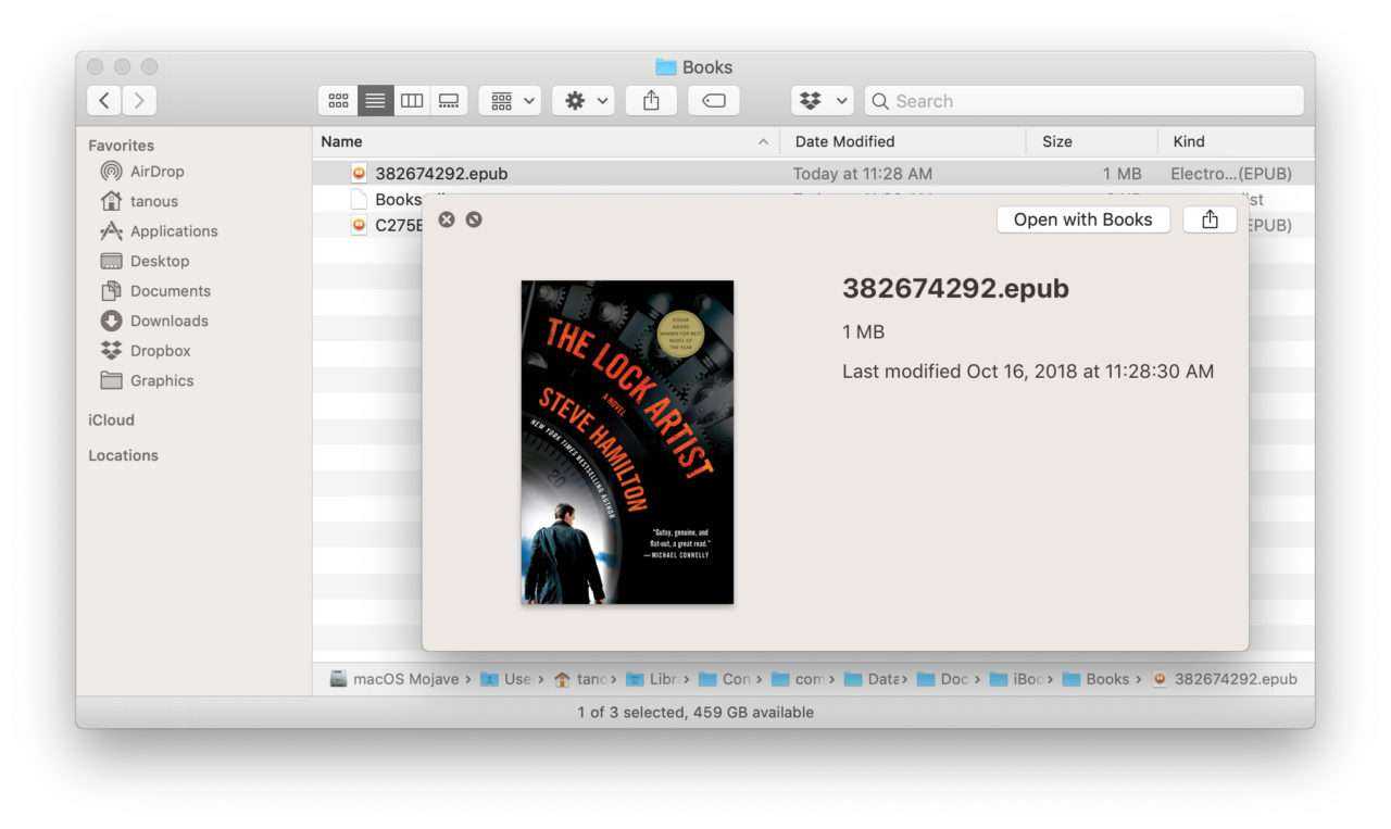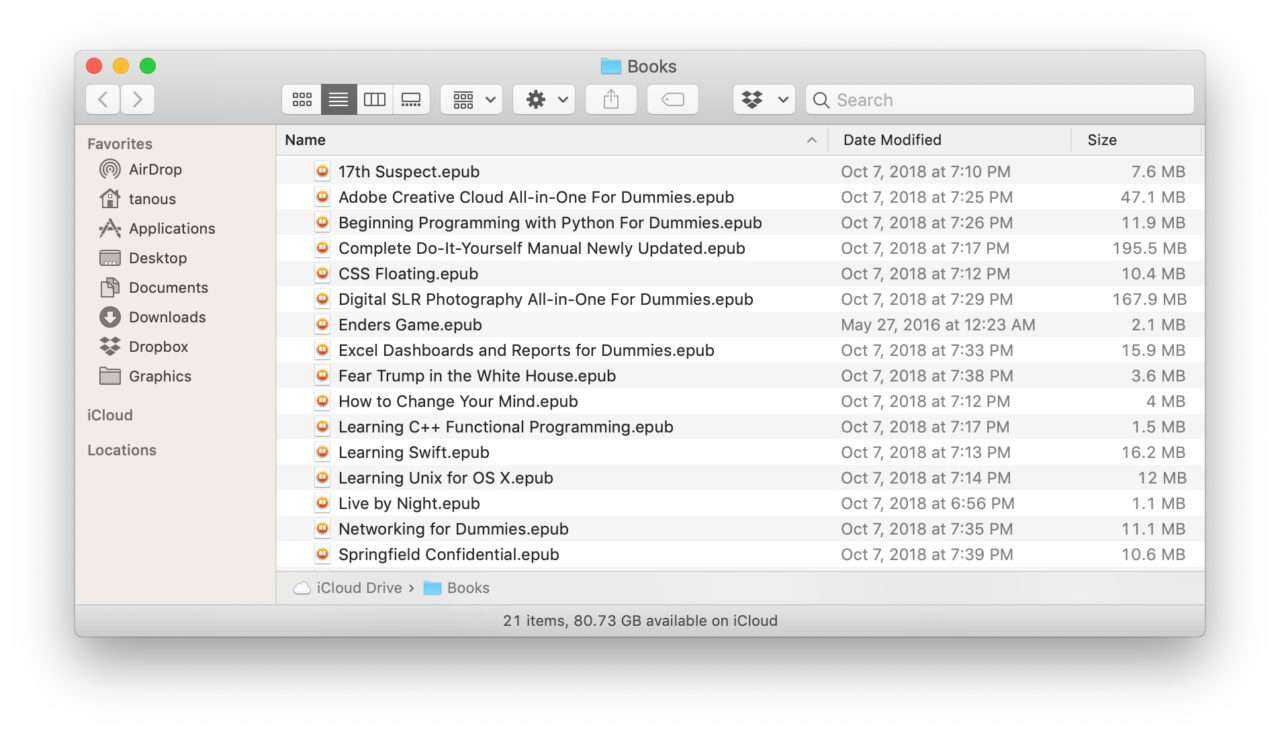 This open command will open a Finder window displaying all of your imported Apple Books files. Since you added these files to the Apple Books app, they shouldn’t have DRM and you can, therefore, copy and backup these files for use in other apps that are compatible with the ePUB format.