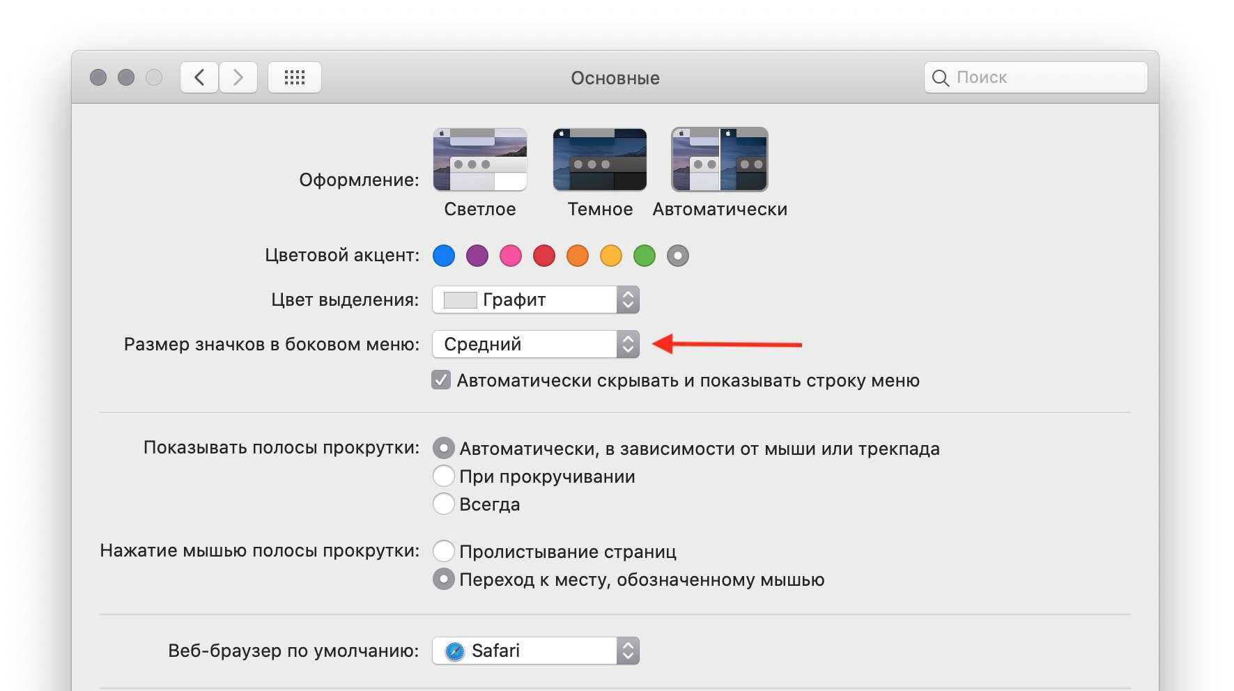 Чтобы изменить размер значков в боковом меню, перейдите в Системные настройки > Основные. Выберите нужный размер (малый, средний или большой).