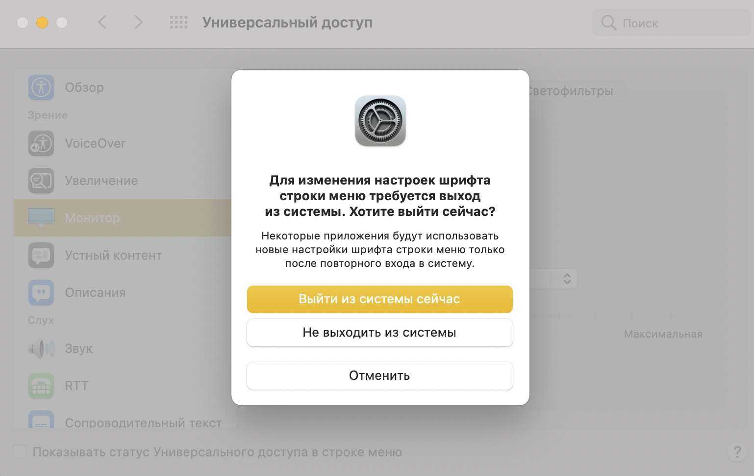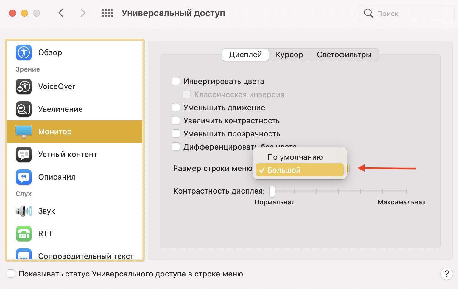 Все эти параметры доступны по пути: Системные настройки > Универсальный доступ > Монитор > Дисплей . Поставьте галочку напротив нужных вам параметров настройки экрана.
