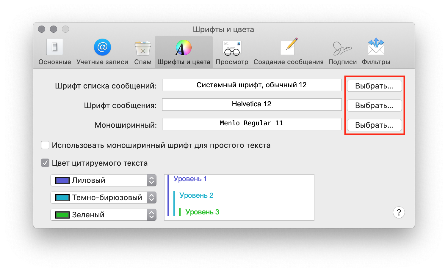 Чтобы увеличить размер текста в Почте: откройте Почту > Настройки и на вкладке Шрифты и цвета установите нужные вам размер текста и шрифт с помощью кнопки «Выбрать».