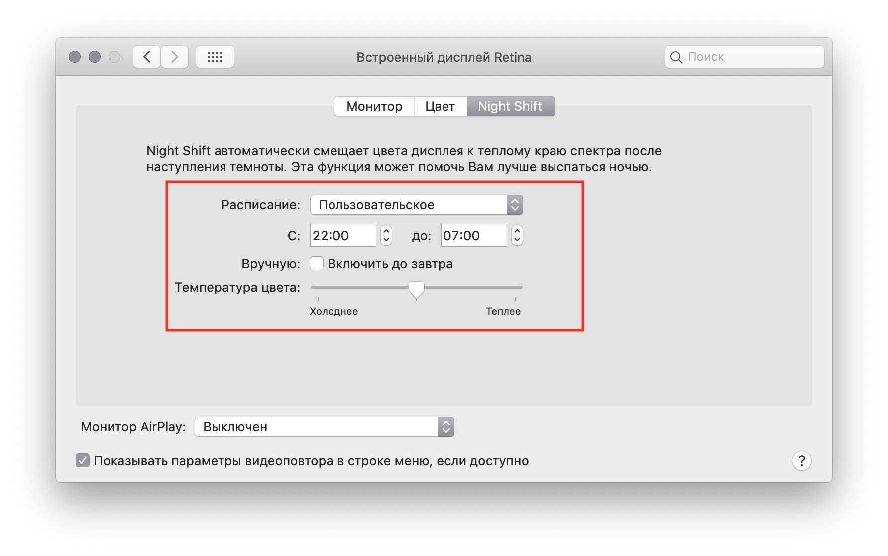 Ночной режим на Mac делает цвет дисплея более теплым при наступлении темного времени суток. Режим может включаться автоматически вечером и выключаться утром. Также расписание можно задать вручную: например, ночной режим будет активен с 22:00 до 7:00.