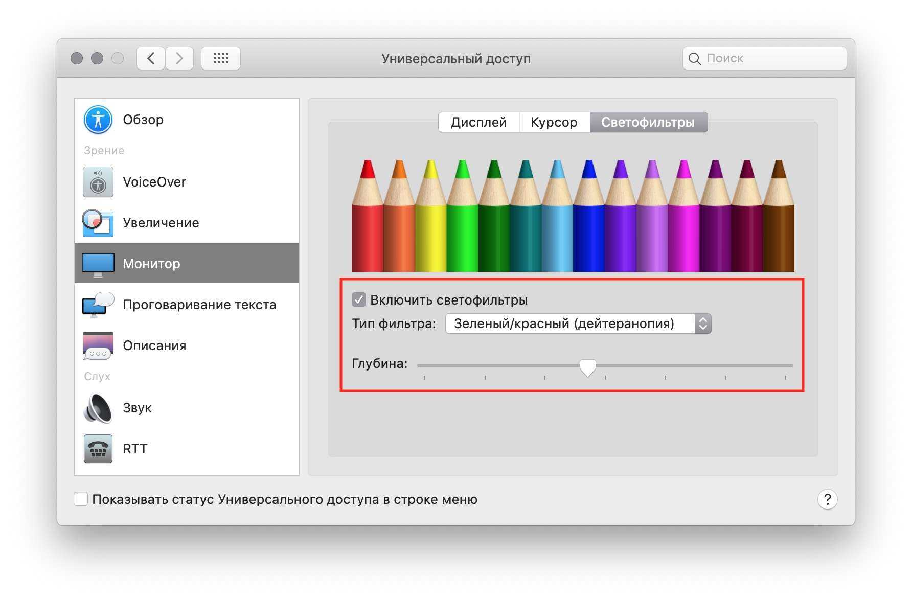 1) Откройте Системные настройки > Универсальный доступ > Монитор > раздел Светофильтры.