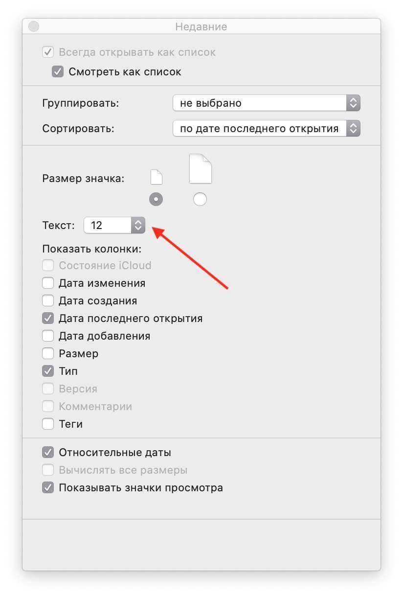 Вы можете изменить размер текста можно и в Finder. Для этого откройте Finder, нажмите Вид > Показать параметры вида в строке меню. Выберите размер текста и иконок.