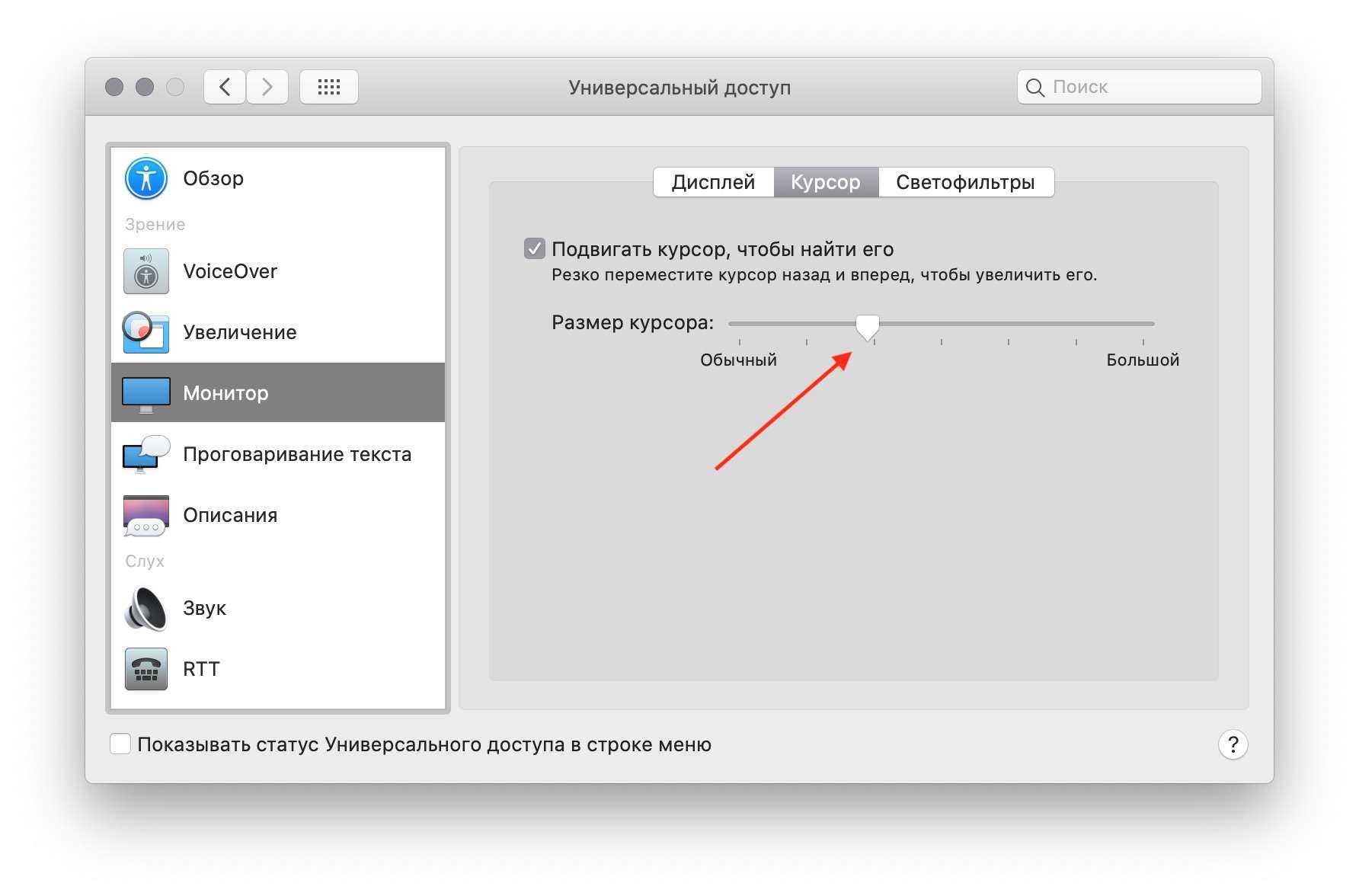 Если заданный по умолчанию размер указателя для вас слишком мал, его можно увеличить. Для этого откройте Системные настройки > Универсальный доступ > Монитор и выберите вкладку Курсор. Перемещайте ползунок до нужно вам размера указателя.