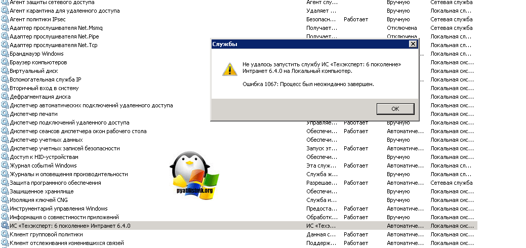 Добрый день уважаемые читатели и подписчики блога, продолжаем пополнять свою коллекцию решенными ошибками и синими экранами, типа «dpc watchdog violation». Сегодня мы с вами рассмотрим ошибку 1067: процесс был неожиданно завершен. Не удалось запустить службу ИС «Техэксперт»: 6 поколение. Интранет 6.4.0 на локальный компьютер. Давайте разбираться в чем собственно дело.