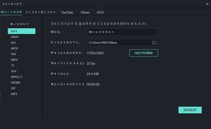 - В появившемся окне выбрать название файла, место куда он экспортируется и качество видео. Нажать кнопку «Экспорт».