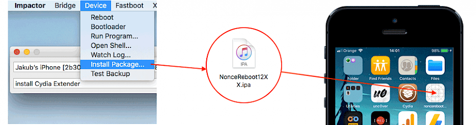 Step 1. Connect your device. Open Cydia Impactor and navigate to Device → Install Package.