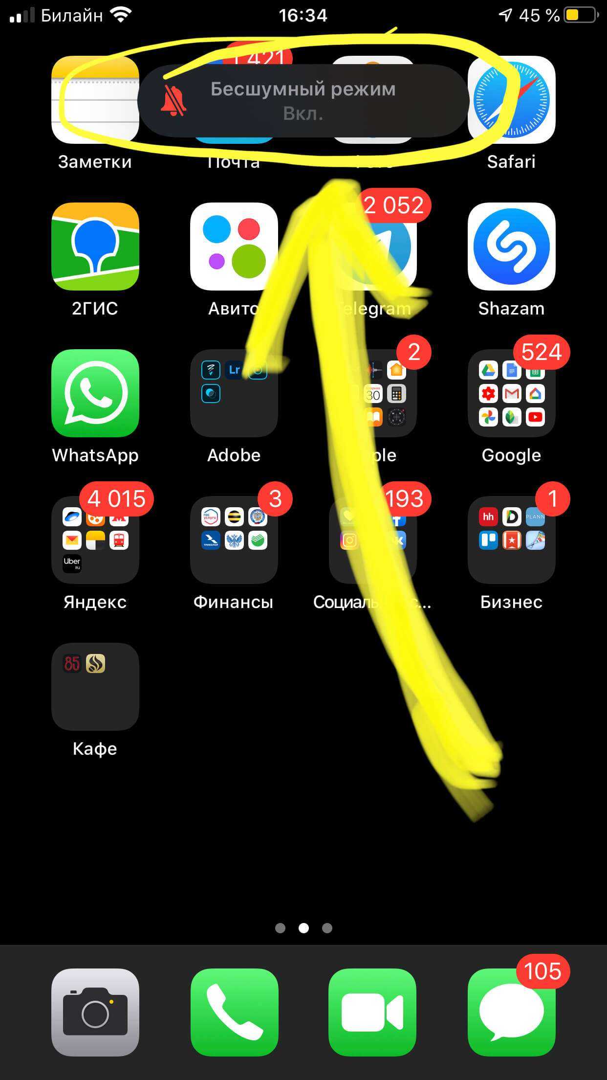Рисунок 2. На экране отобразился значок бесшумного режима.