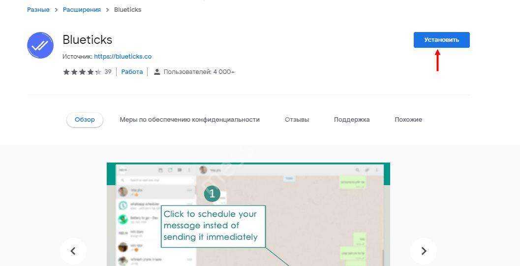 Просто найдите WhatsApp Scheduler через магазин дополнений Гугл Хром и установите его привычным способом, кстати, в магазине расширений оно называется Blueticks.