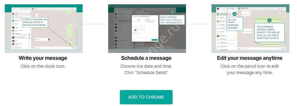А как отправить отложенное сообщение в Ватсап на компьютере? Такая возможность существует (отличные новости). В Google Chrome есть специальное расширение, интегрированное в веб-версию мессенджера.