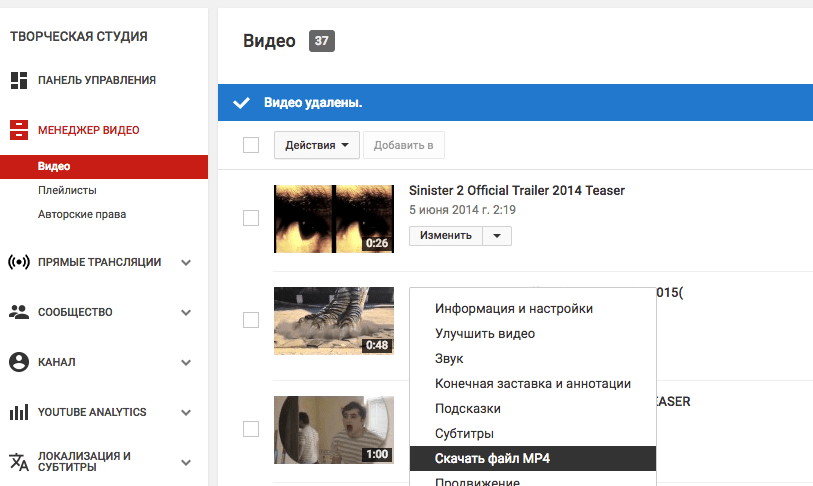 Так, перейдите в раздел «Менеджер видео» и нажмите на «Редактировать» рядом с контентом, после чего выбираем «Сохранить на ПК».