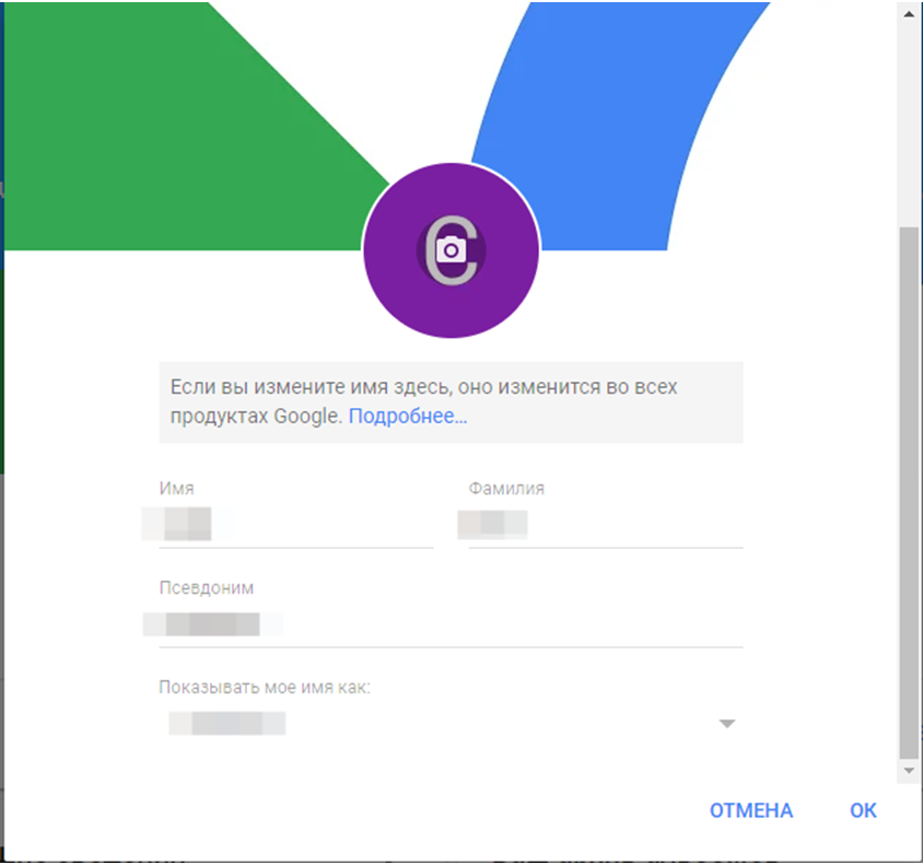 После всех выполненных действий на вашем компьютере откроется страничка, где вы сможете изменить имя и фамилию в ютуб. И так чтобы продолжить и сменить имя в ютуб, вам нужно будет в поле «Имя» и «Фамилия» указать нужное вам имя и фамилию, затем нажать на кнопку «OK».