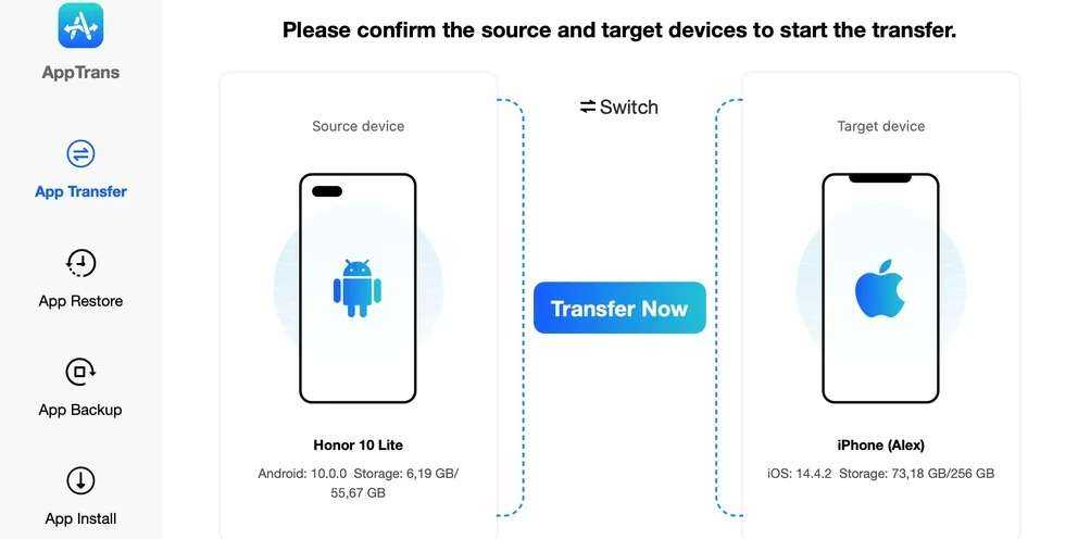 Как только ваши мобильные телефоны будут подключены, запустите AppTrans на своем компьютере. Затем следуйте инструкциям на экране, чтобы перенести данные WhatsApp с iPhone на телефон Android .