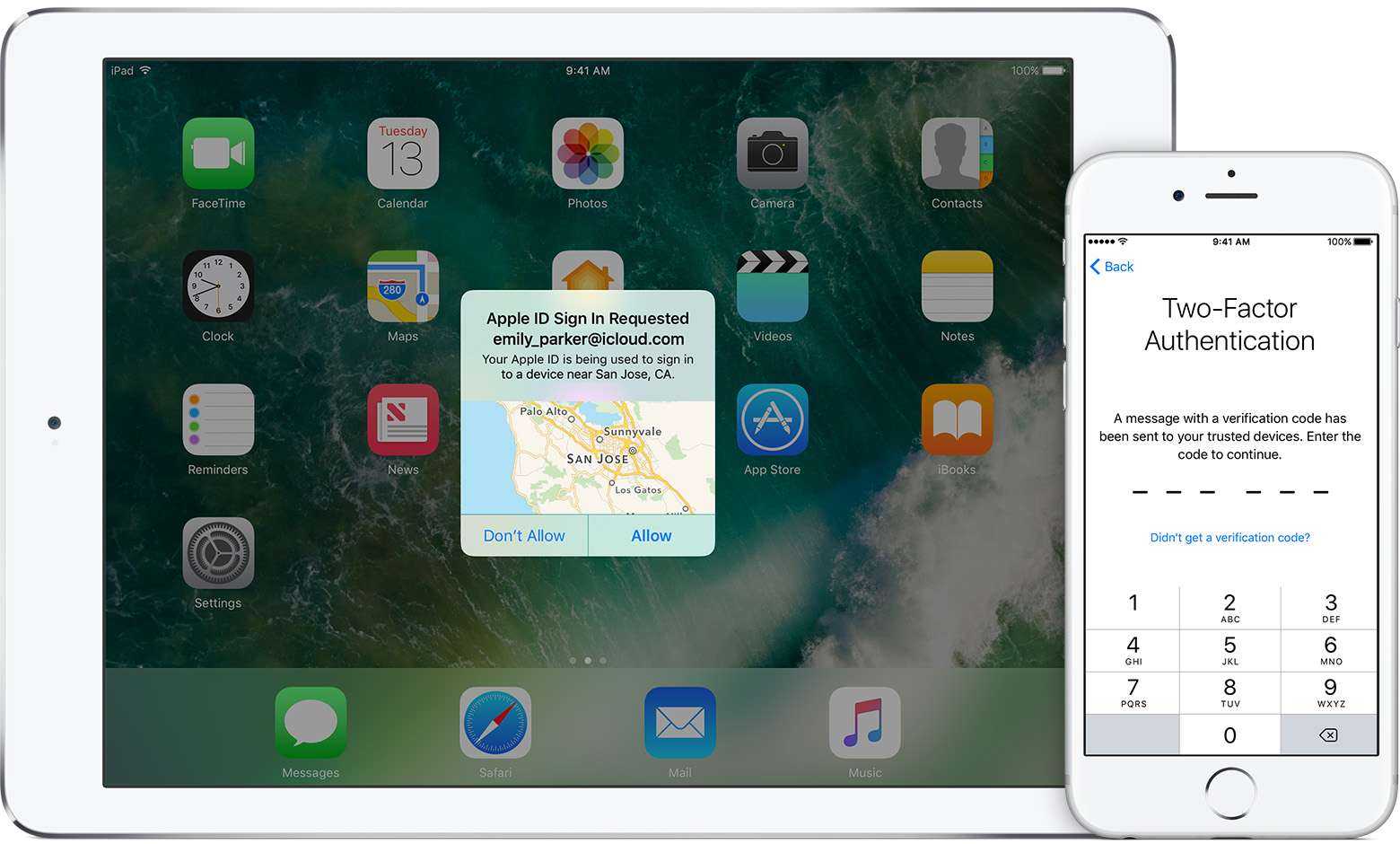 Двухфакторная аутентификация появилась как составная часть iOS 9 и вышедшей одновременно с ней версии macOS. Новый метод включает дополнительную проверку при любой попытке зайти в учетную запись Apple ID с нового устройства: на все доверенные устройства (iPhone, iPad, iPod Touch и компьютеры под управлением свежих версий macOS) моментально приходит интерактивное уведомление. Чтобы получить доступ к уведомлению, нужно разблокировать устройство (паролем или датчиком отпечатка пальцев), а для получения одноразового кода потребуется нажать на кнопку подтверждения в диалоговом окне.